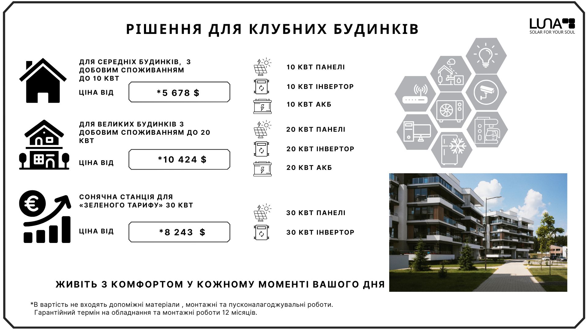 Клубні будинки, як елітна нерухомість, вимагають високого рівня комфорту та енергоефективності. Наші сонячні рішення для клубних будинків забезпечують стабільне і екологічне енергопостачання, підвищуючи рівень життя мешканців та знижуючи витрати на електроенергію.