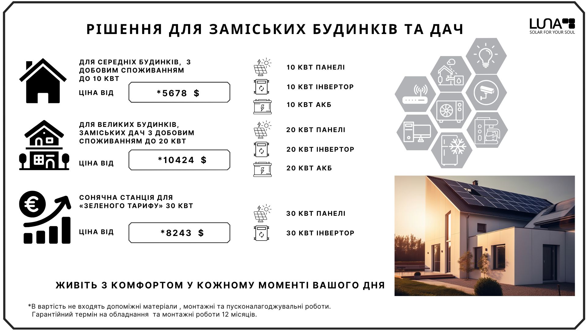 Luna допомагає реалізувати проєкти будь-якої складності: від невеликих квартирних рішень до потужних систем на десятки кіловат. Оберіть своє рішення, встановіть сонячні панелі для дому та користуйтеся чистою енергією щодня.