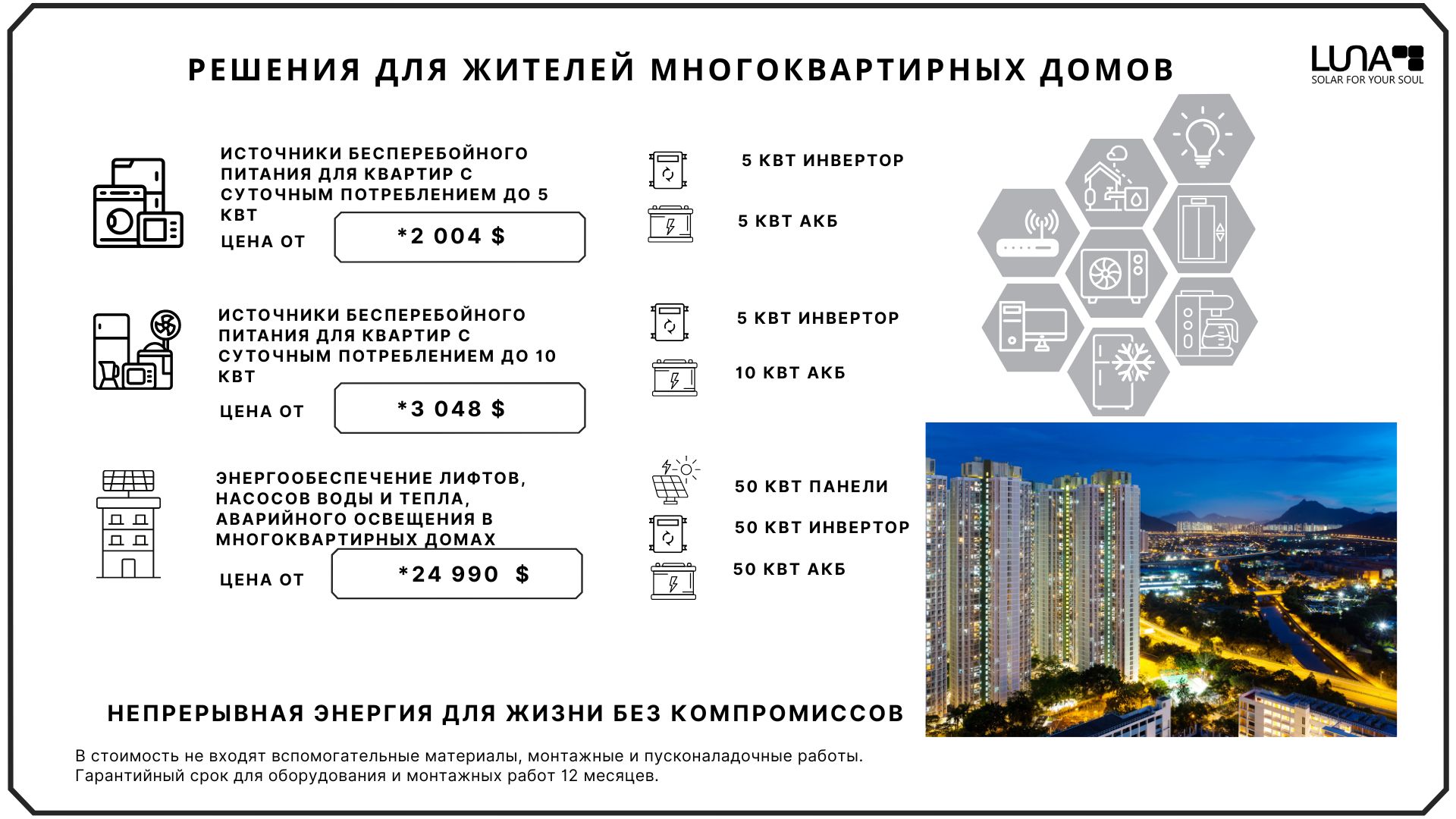 Для владельцев квартир и жильцов многоэтажных домов мы предоставляем эффективные современные решения, позволяющие значительно снизить затраты на электроэнергию и обеспечить себя и свою семью стабильной энергией. Наши системы резервного питания создают комфорт для вас и вашей семьи на время до 48 часов бесперебойного энергоснабжения в период, когда это действительно важно и нужно