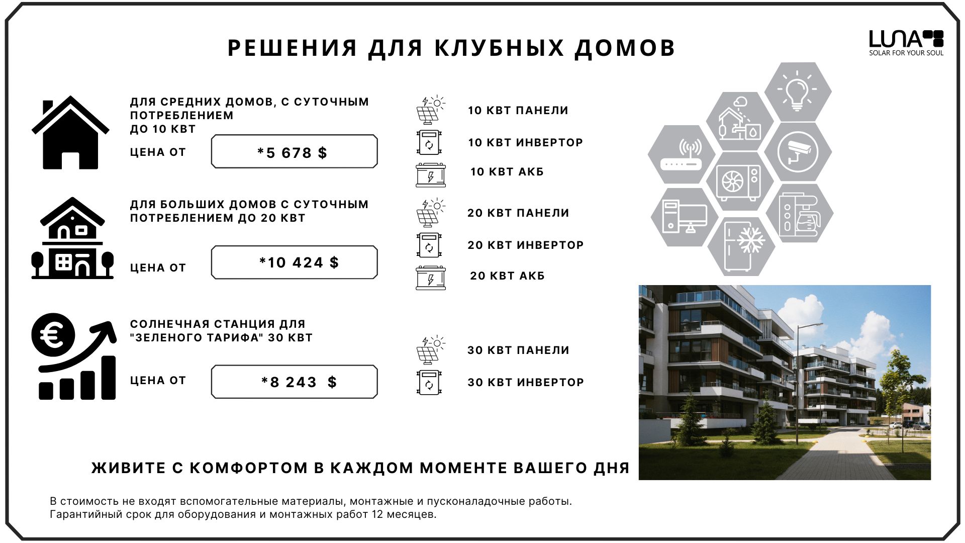 Luna помогает реализовать проекты любой сложности: от небольших квартирных решений до мощных систем на десятки киловатт. Выберите свое решение, установите солнечные панели для дома и пользуйтесь чистой энергией каждый день.